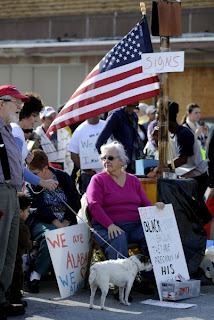 Trish Rice, seated, Birmingham, makes a sign as protesters speak out against Alabama House Bill 56 and the U.S. Immigration and Customs Enforcement program December 3, 2011 near the Etowah County Detention Center in downtown Gadsden, Ala. Members of Occupy Birmingham organized the protest. (Gadsden Times, Sarah Dudik)
